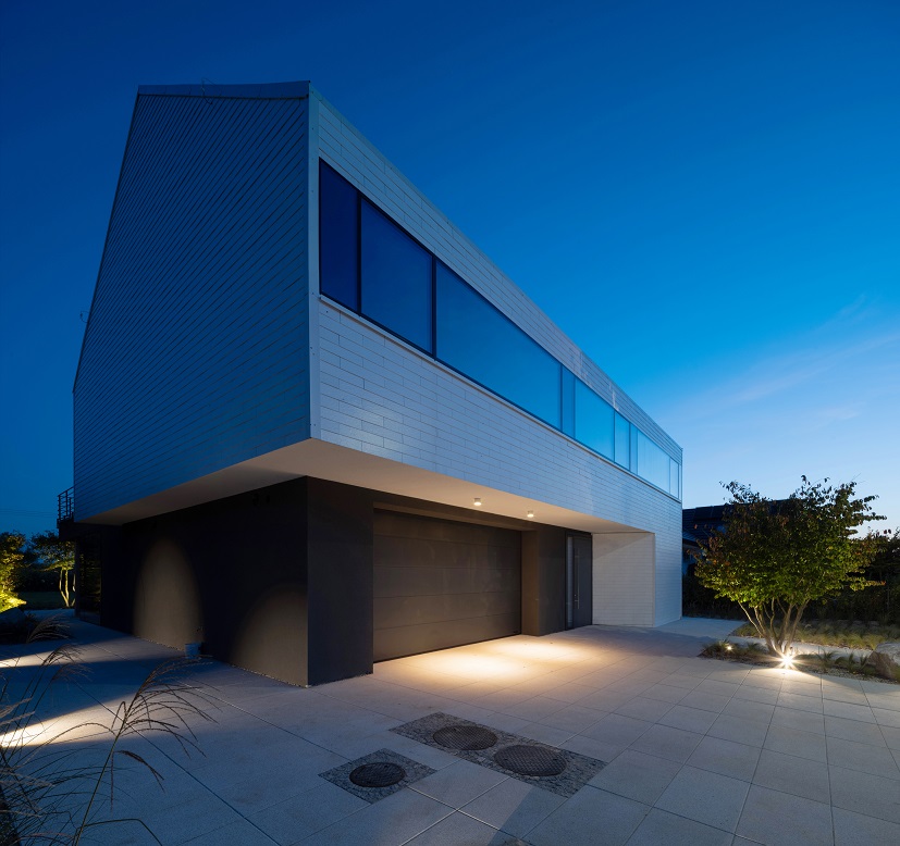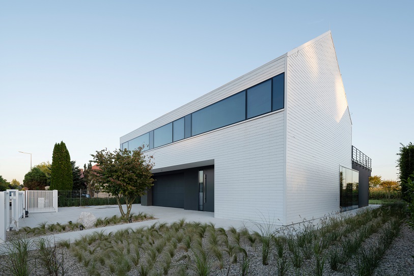 Architekci postawili na czystą, syntetyczną formę, w której dominują proste linie, kontrastujące materiały i spójna paleta barw. Dom składa się z dwóch przenikających się brył – masywnego, grafitowego parteru oraz lekkiego, białego piętra, unoszącego się nad terenem niczym monolit. Od strony ogrodu przestrzeń otwiera się dużymi przeszkleniami, łącząc wnętrze z naturą. Panoramiczne witryny z przesuwnymi skrzydłami zapewniają niezakłócony widok na ogród, który płynnie przechodzi w zielony taras na piętrze.