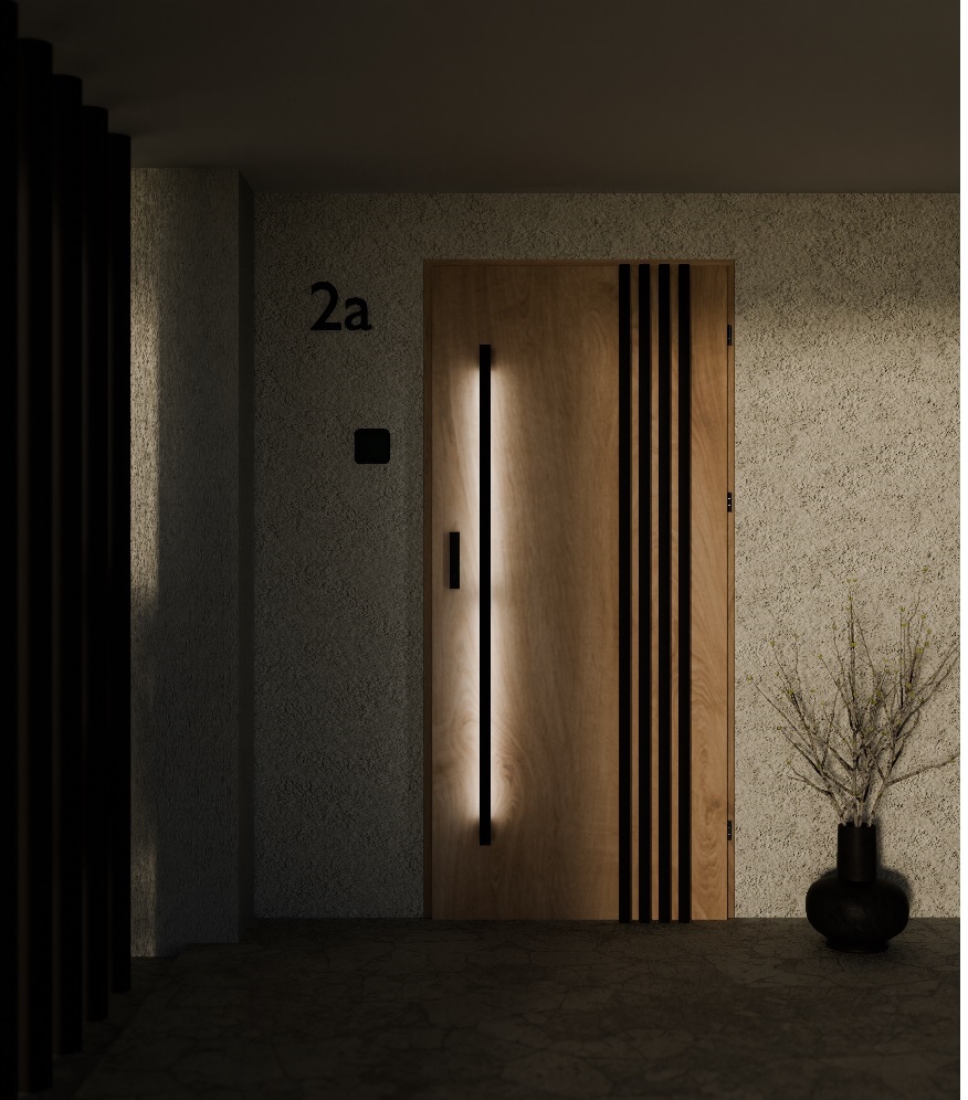 To element, który zachwyca swoją prostotą i elegancją – delikatne światło LED subtelnie podkreśla linię drzwi, tworząc efekt lekkości i nowoczesności. Po zmroku antaba staje się nie tylko ozdobą, ale też praktycznym ułatwieniem – oświetla przestrzeń wejścia, ułatwiając otwieranie drzwi i zapewniając większe bezpieczeństwo.