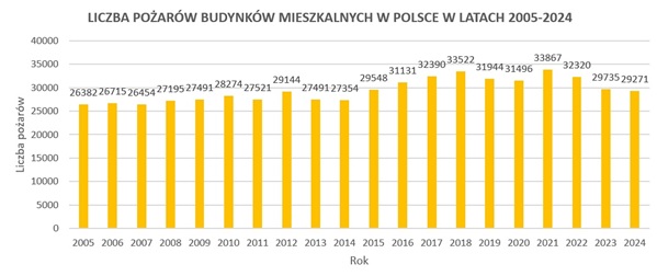 Rys. PSPS: Statystyka pożarów budynków mieszkalnych w latach 2005-2024 (Dane: KGPSP)[3]