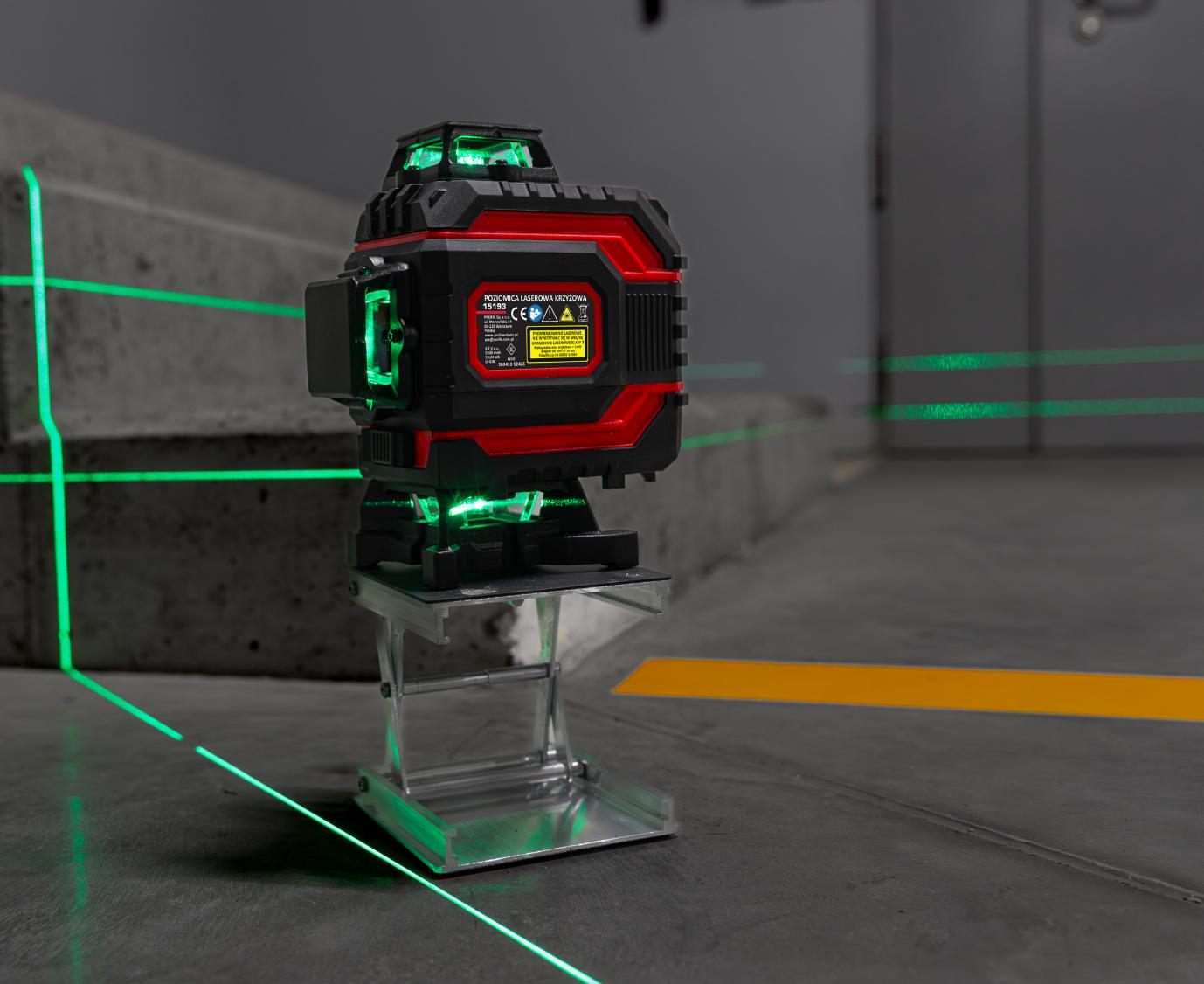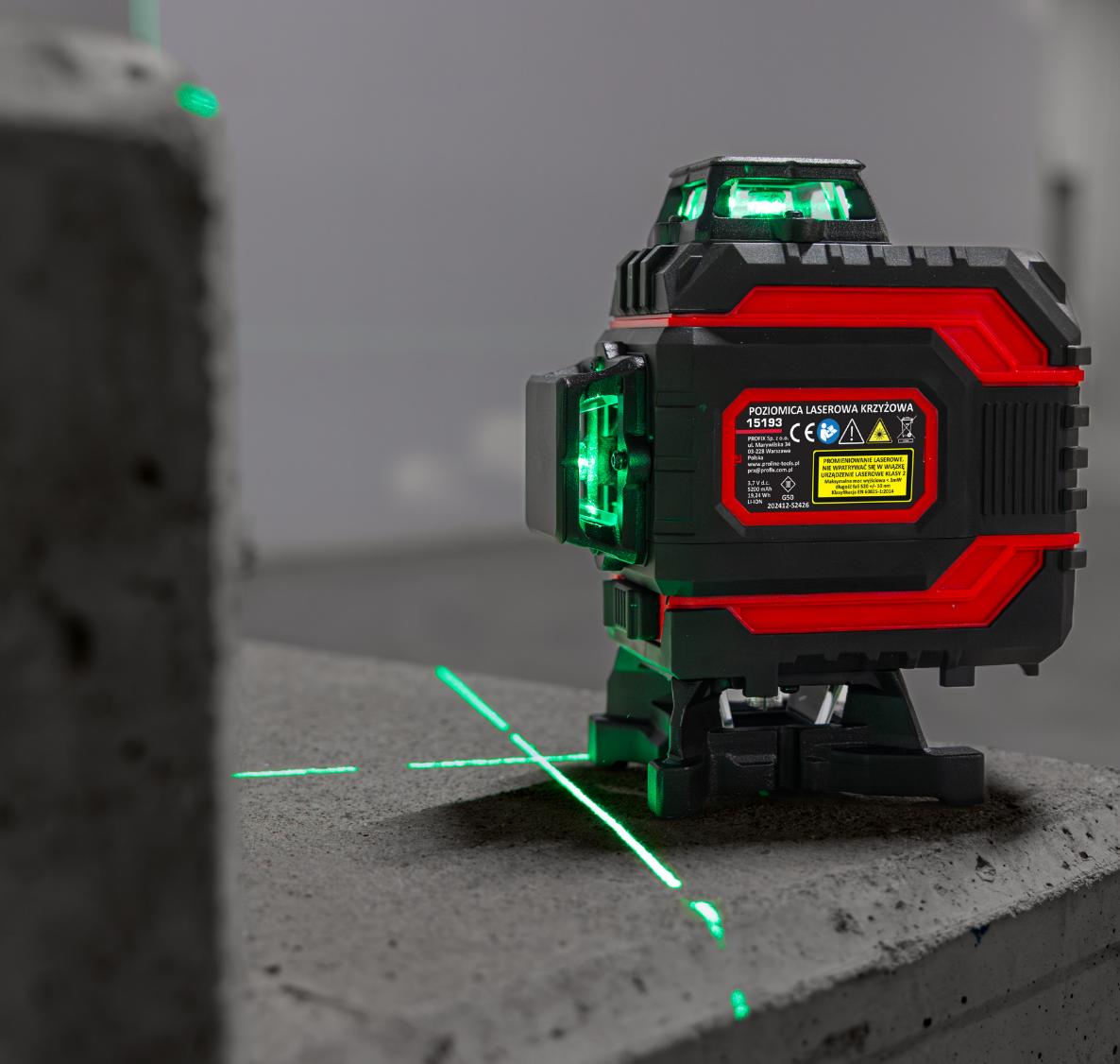 Poziomica laserowa 4D PROLINE 15193 to przenośne urządzenie pomiarowe, które upraszcza i przyspiesza  prace budowlane, wykończeniowe i instalatorskie – czyli wszystkie, które wymagają precyzji w wyznaczaniu konkretnych punktów oraz linii konstrukcyjnych i płaszczyzn. Produkt generuje 4 płaszczyzny niwelacji, a zielona wiązka lasera jest 4 razy lepiej widzialna od konwencjonalnego lasera czerwonego. Przykręcany uchwyt umożliwia łatwy i bezpieczny montaż do statywu, a mocny magnes w uchwycie pozwala na montowanie lasera na pionowych profilach metalowych.